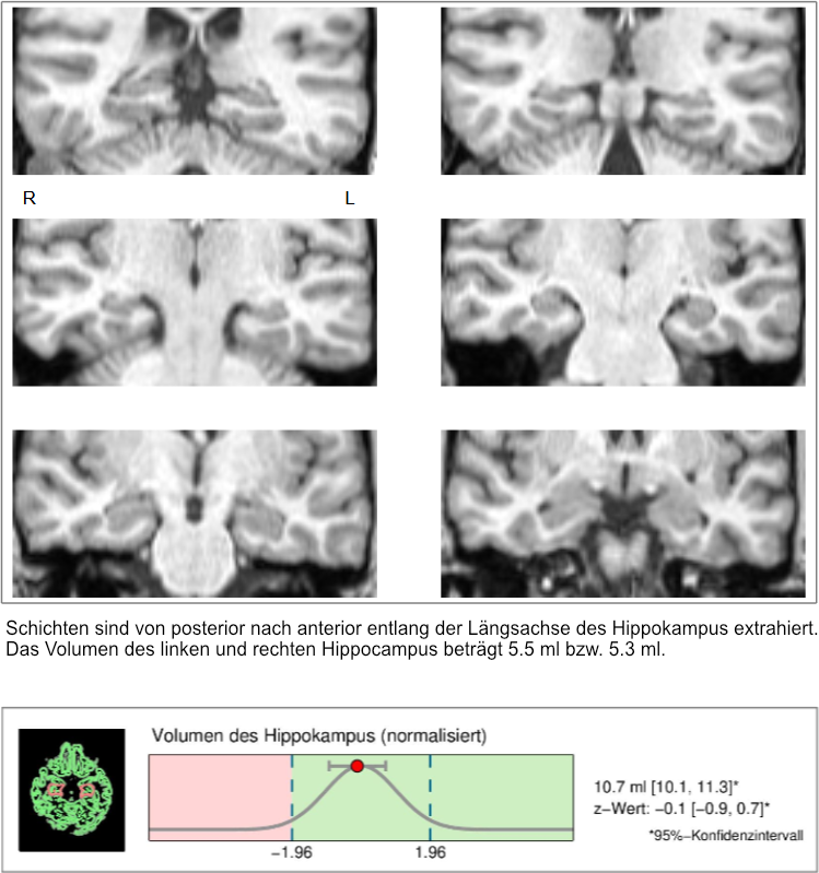 Based on structural magnetic resonance imaging (MRI) data of the head, the individual hippocampal volume is determined with the help of a computer-assisted procedure. The MRI examination takes only a few minutes and is performed without the administration of contrast medium.